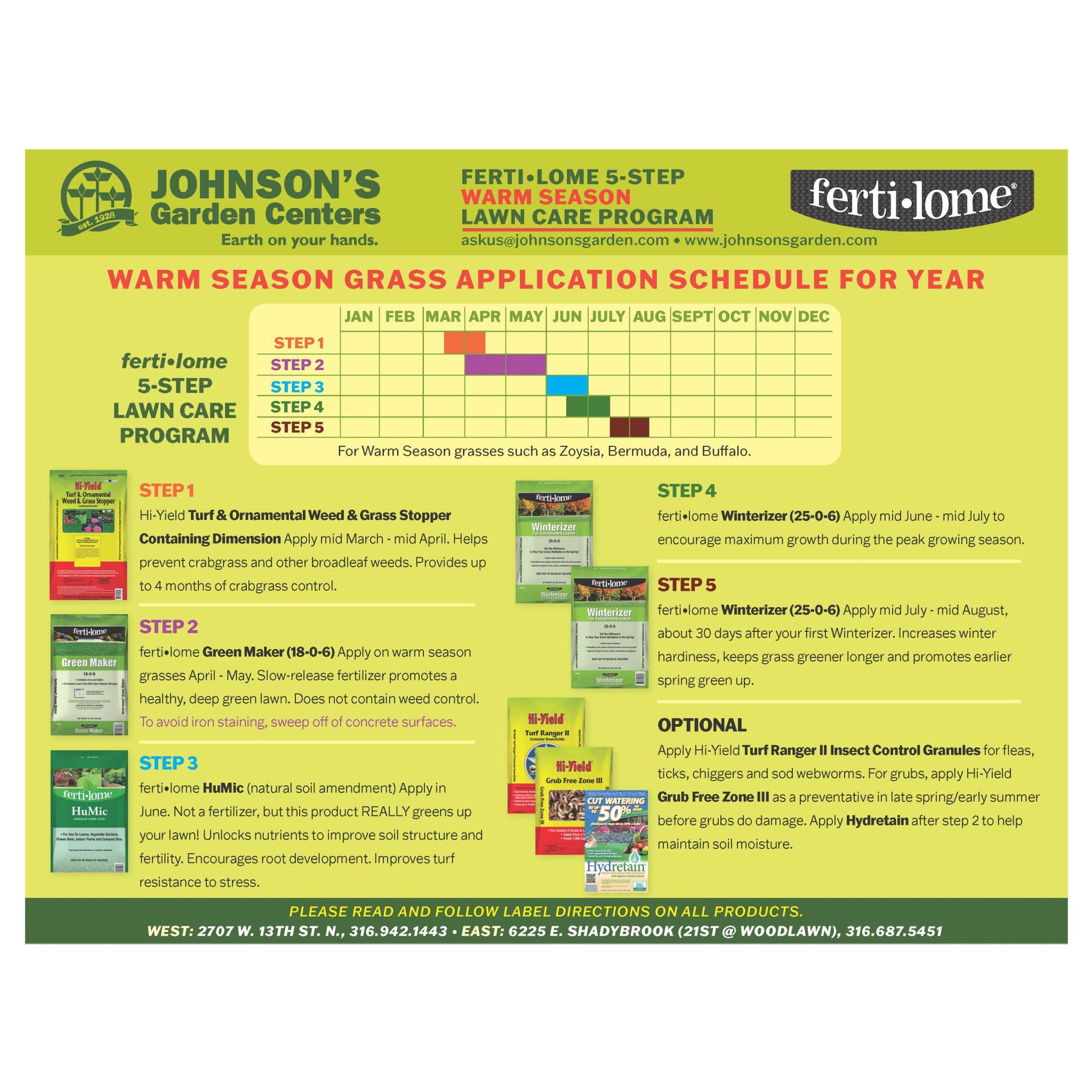 If you want a healthy green lawn that's the envy of the neighborhood, you need the ferti-lome 5-Step Lawn Care Program from Johnson's Garden Center. We've taken the guesswork out of lawn care in the central midwest. Our 5-step program combines our knowledge and everything you need to weed, fertilize, and winterize your grass. Order a lawn care program, and you'll be prepared for an entire year!